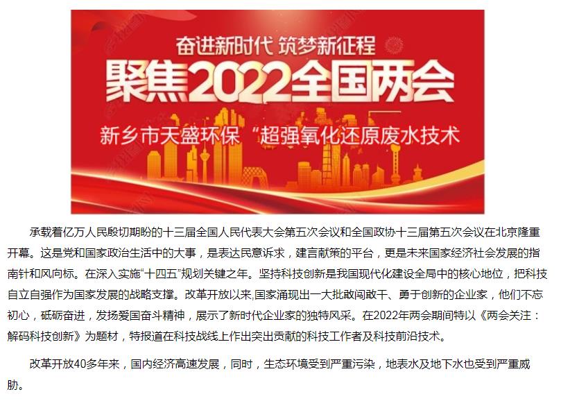 中國高新技術網發布:《關注:解碼科技創新》——新鄉市天盛環?!俺瑥娧趸€原廢水處理技術”